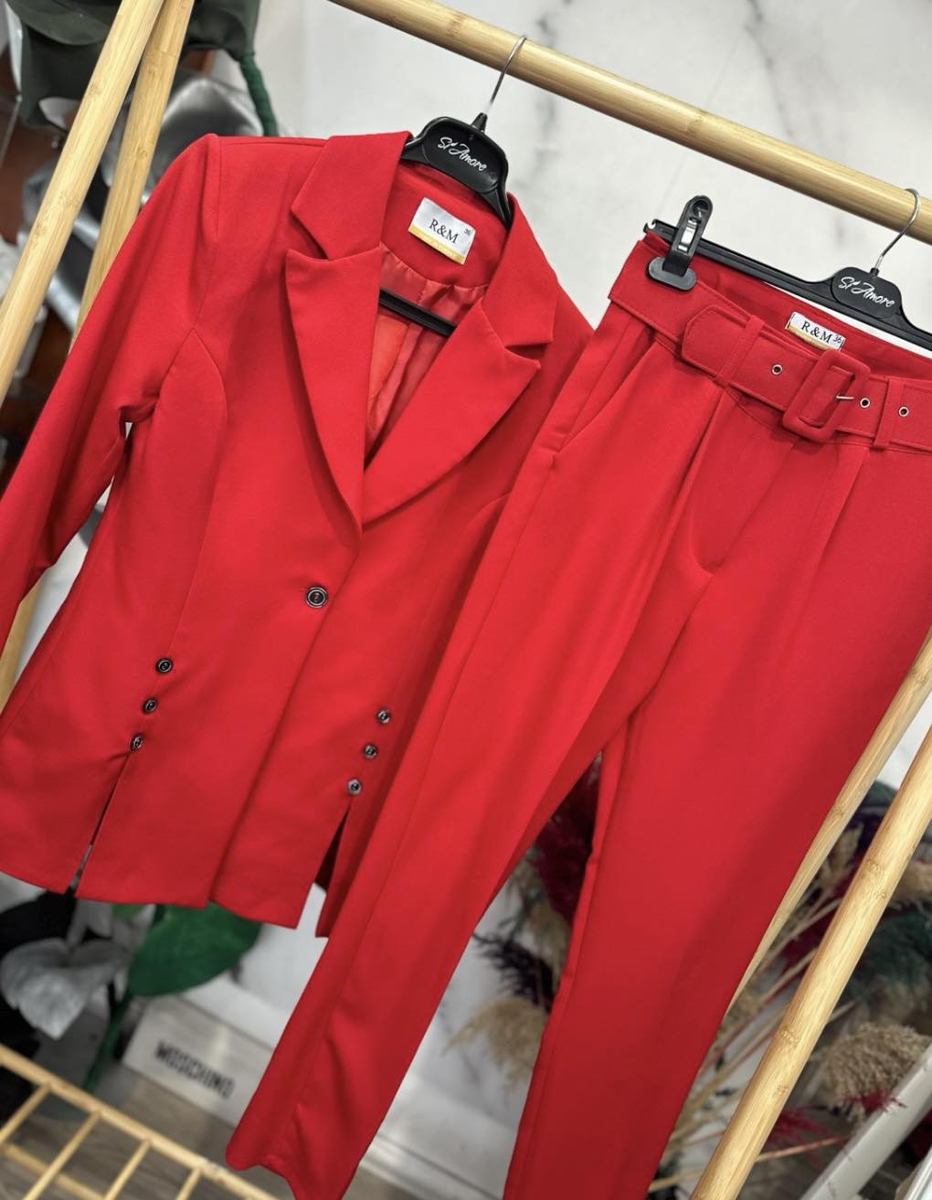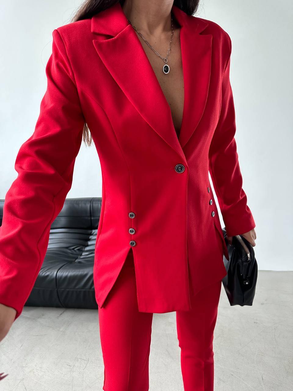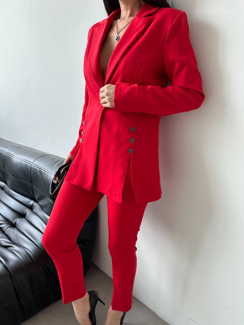 Елегантен дамски костюм от вталено двуредно сако с декоративни копчета. Изработен от приятна материя с добавка на вискоза. Леко вталената кройка на сакото е със закопчаване с копче. На джобовете има капаци, а за по-добър силует има подплънки за раменете. Панталон с висока талия и странични джобове. Закопчаване с цип и копче.